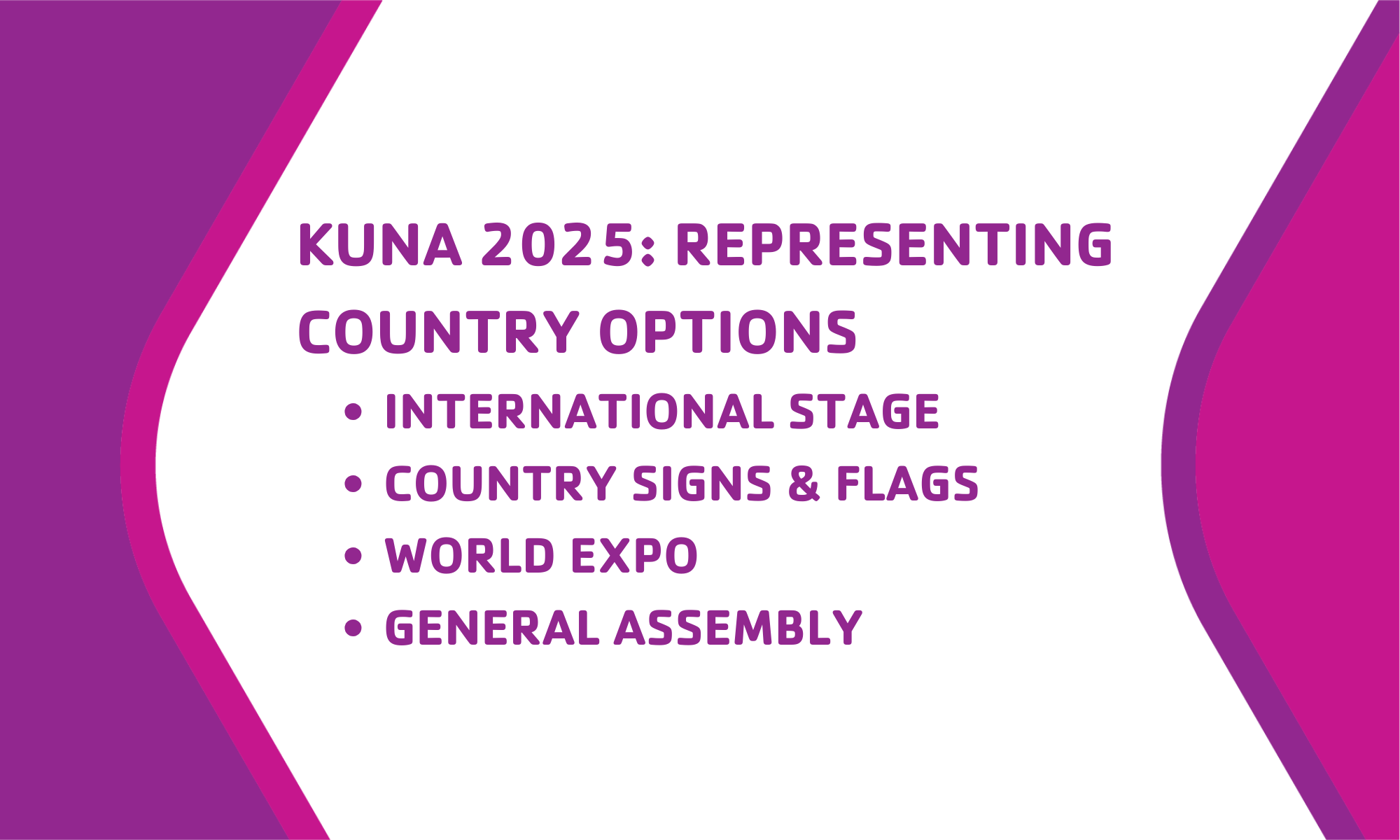 - Country signs with inappropriate depictions of countries will not be allowed to present in the Parade of Nations, may be required to remove from their country display, and/or be removed from receiving awards at the discretion of Y-Staff. If there is a question in regards to a country sign item please reach out to Y-Staff prior to conference.